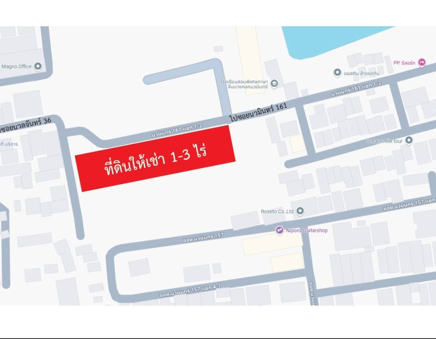 ต้องการให้เช่าที่ดินเปล่าถมแล้วราคาถูก มีเนื้อที่ให้เช่าตั้งแต่ 1 ไร่ จนถึง 3 ไร่ ในถนนนวลจันทร์ซอย 36 เข้าไปในถนนนวลจันทร์ซอย 36 วิ่งตรงไปตลอดข้ามสะพานข้ามคลอง 3 สะพาน ที่ดินที่ให้เช่าผ่านโรงเรียนแช่บเสริม วิ่งตรงตลอดข้ามสะพานข้ามคลองที่ 3 ลงสะพานที่ดินที่ให้เช่าตั้งอยู่ด้านขวามือ ตรงข้ามโรงเรียนสอนภาษาจีน แปลงที่ดินที่ให้เช่าได้ปลูกกล้วยไว้ประมาณ 1 ไร่ ถนนหน้าที่ดินสามารถไปออกถนนนวมินทร์ ซอยนวมินทรฺ 161 ได้ ให้เช่าในราคาไร่ละ 22,000 บาท/ไร่