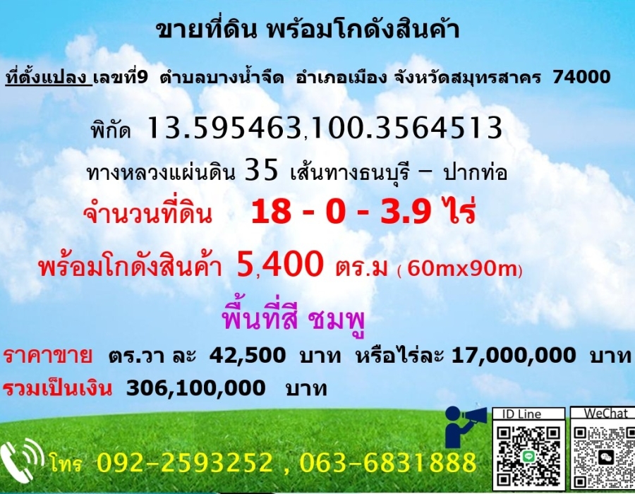 ขายที่ดินพร้อมโกดังสินค้า ขนาด 5,480 ตร.ม.ทางเข้าออกสะดวก สมุทรสาคร